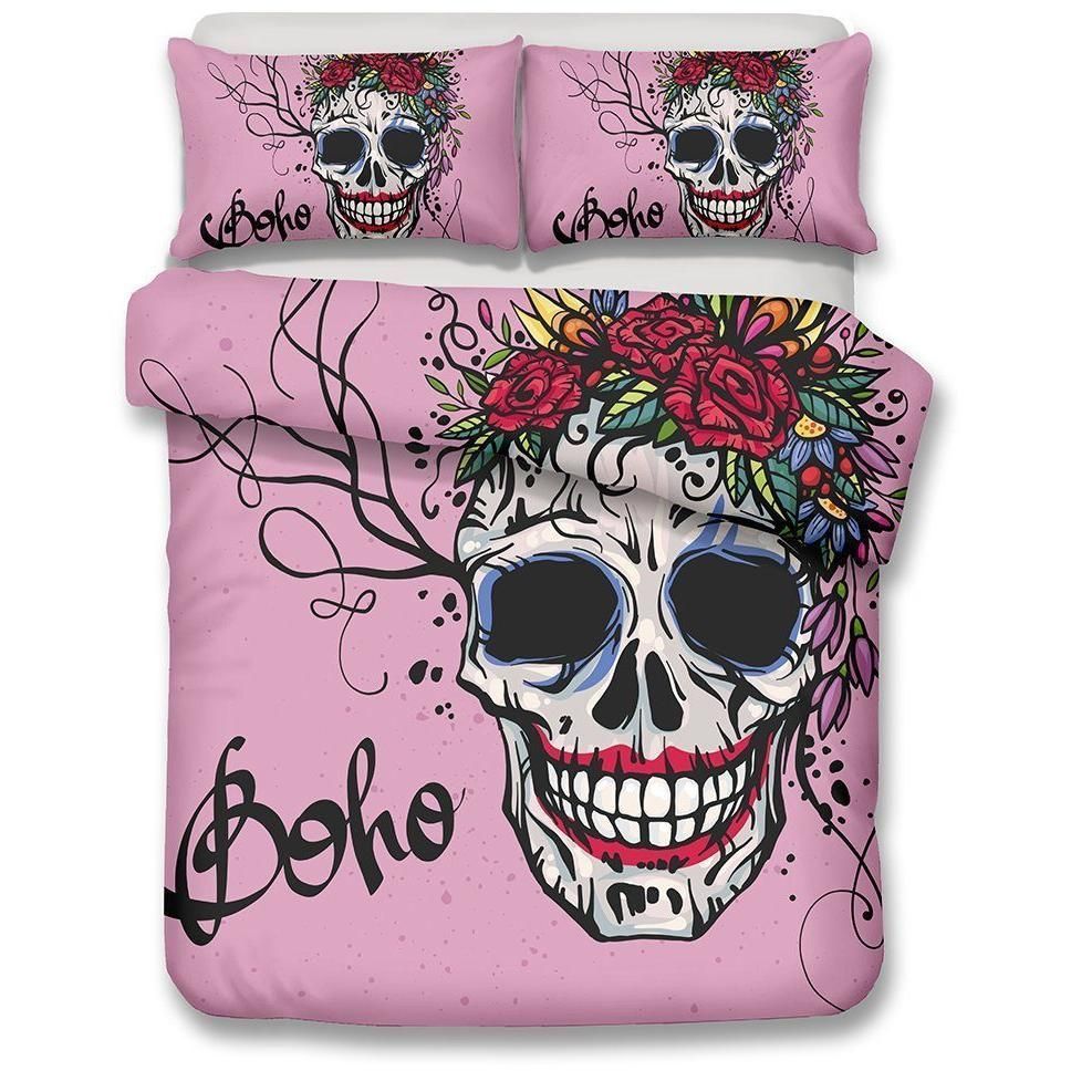 3D Pink Rose Skull Boho Printed Bedding Set Bedroom Decor