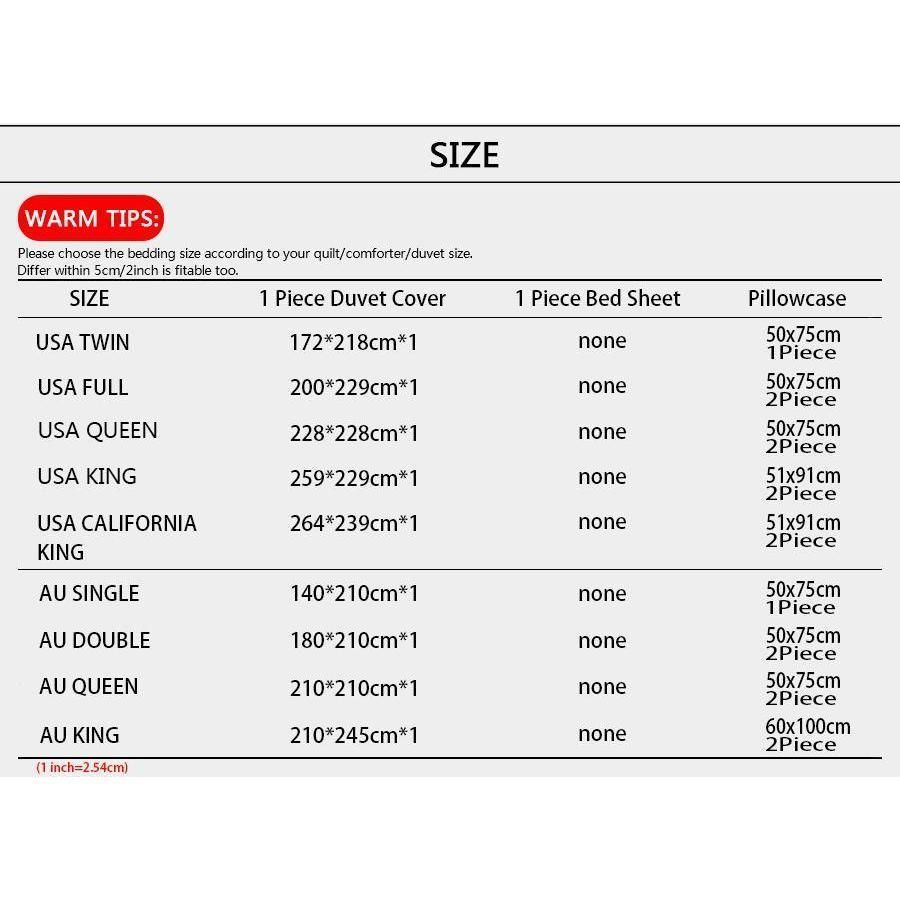 - Twin: 1 Duvet Cover 68×86 in + 2 Pillowcase 19×29 in