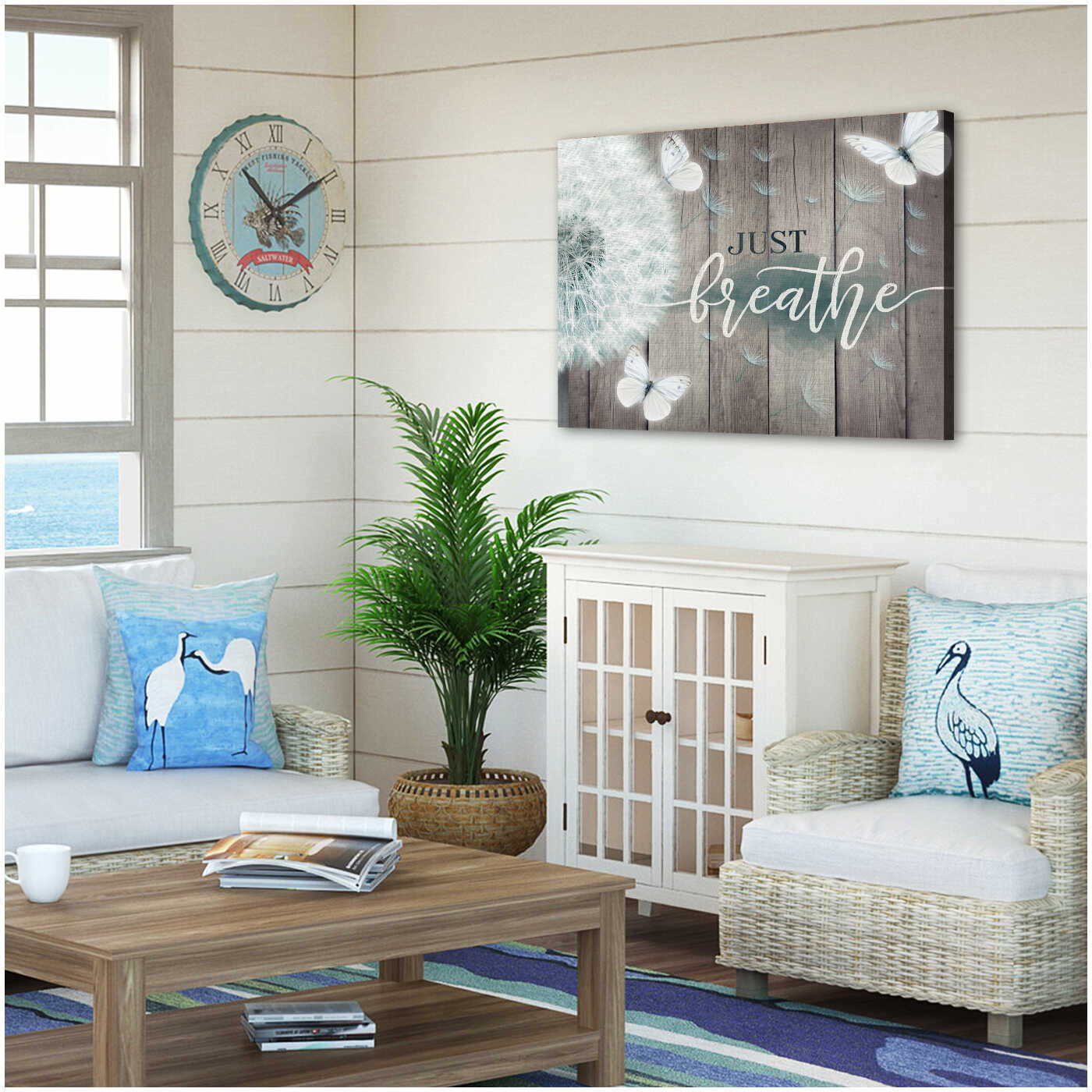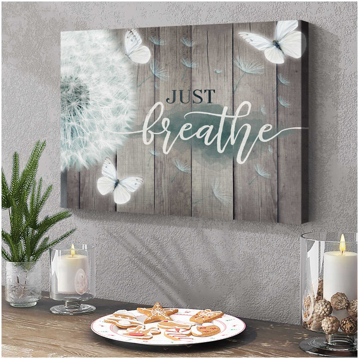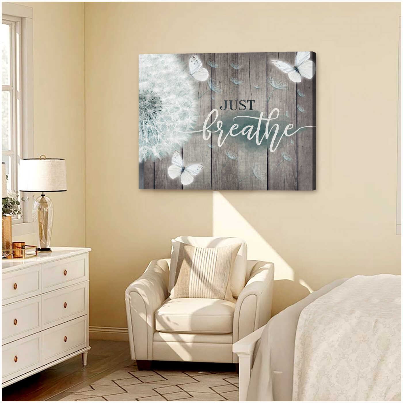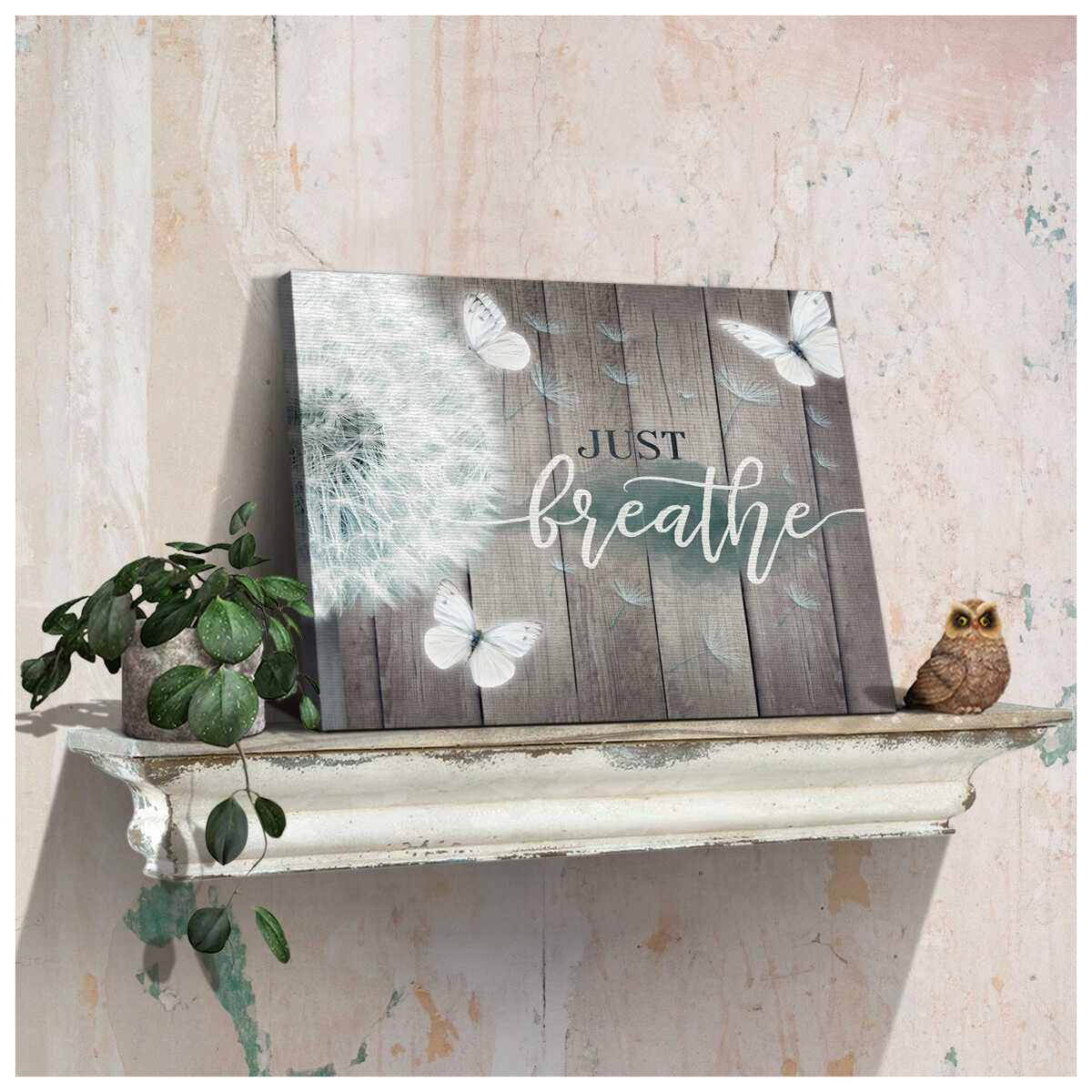Beautiful Dandelion And Butterlies On Gray Vintage Wood Just Breathe Farmhouse Canvas Prints Wall Art Decor
