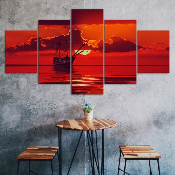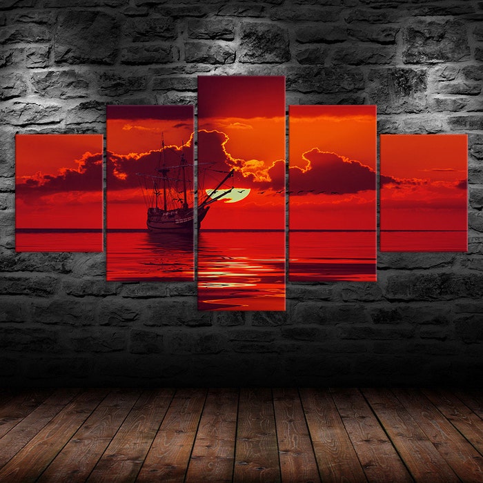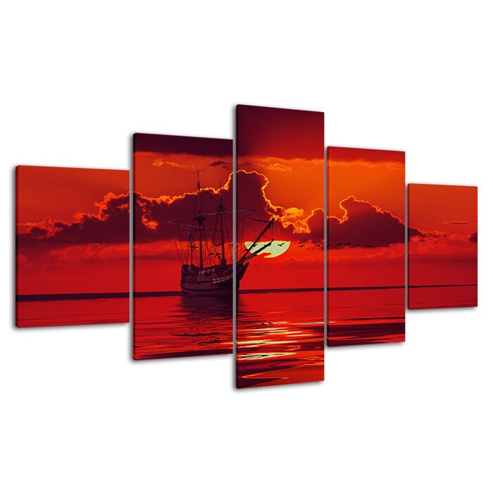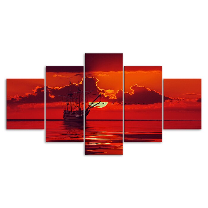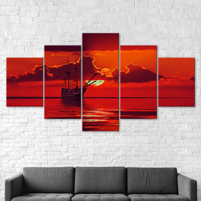 Boat Sunset Red Sky Scenery 5 Piece Five Panel Wall Canvas Print Modern Art Poster Wall Art Decor