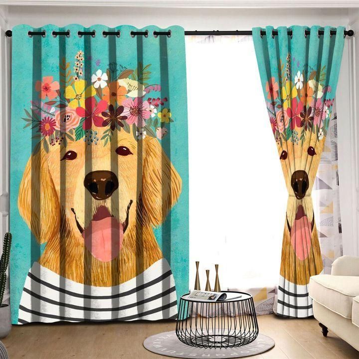 Cartoon Golden Retriever With Flower Printed Window Curtain