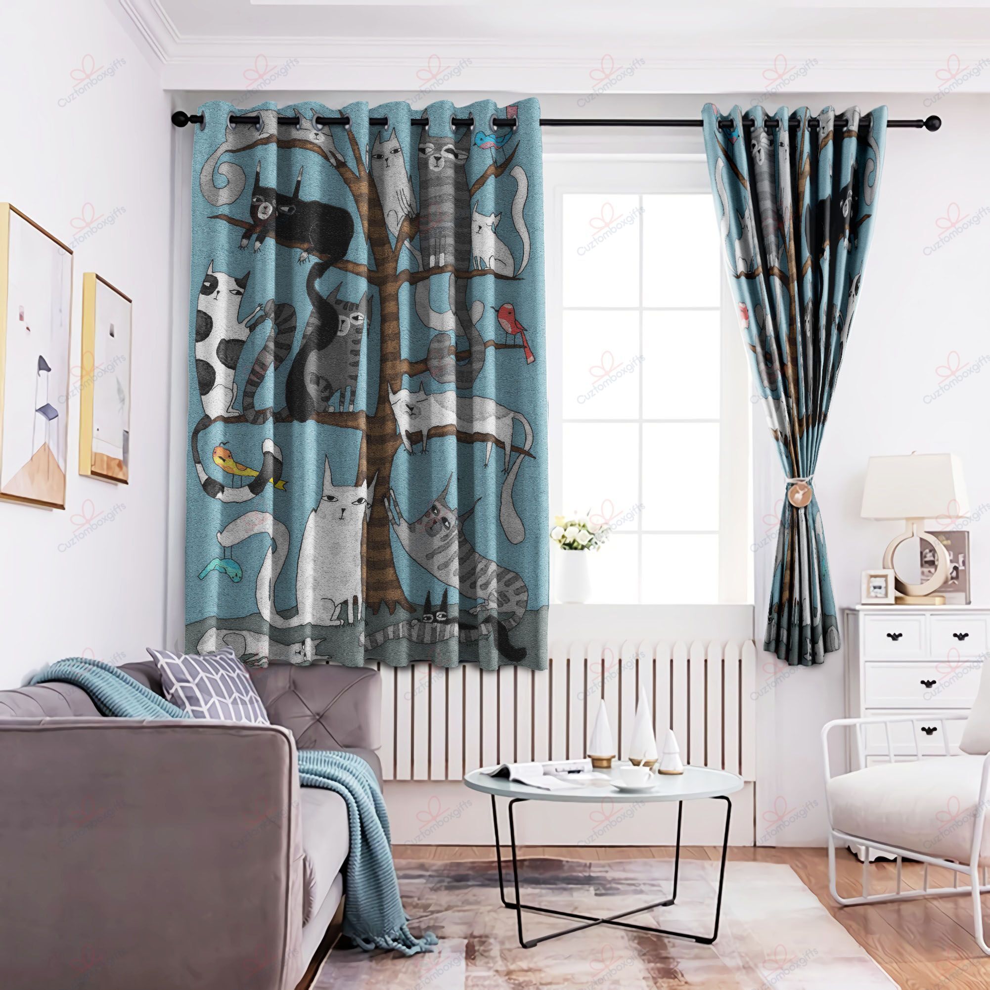 Cat Cute On The Tree Printed Window Curtain Home Decor
