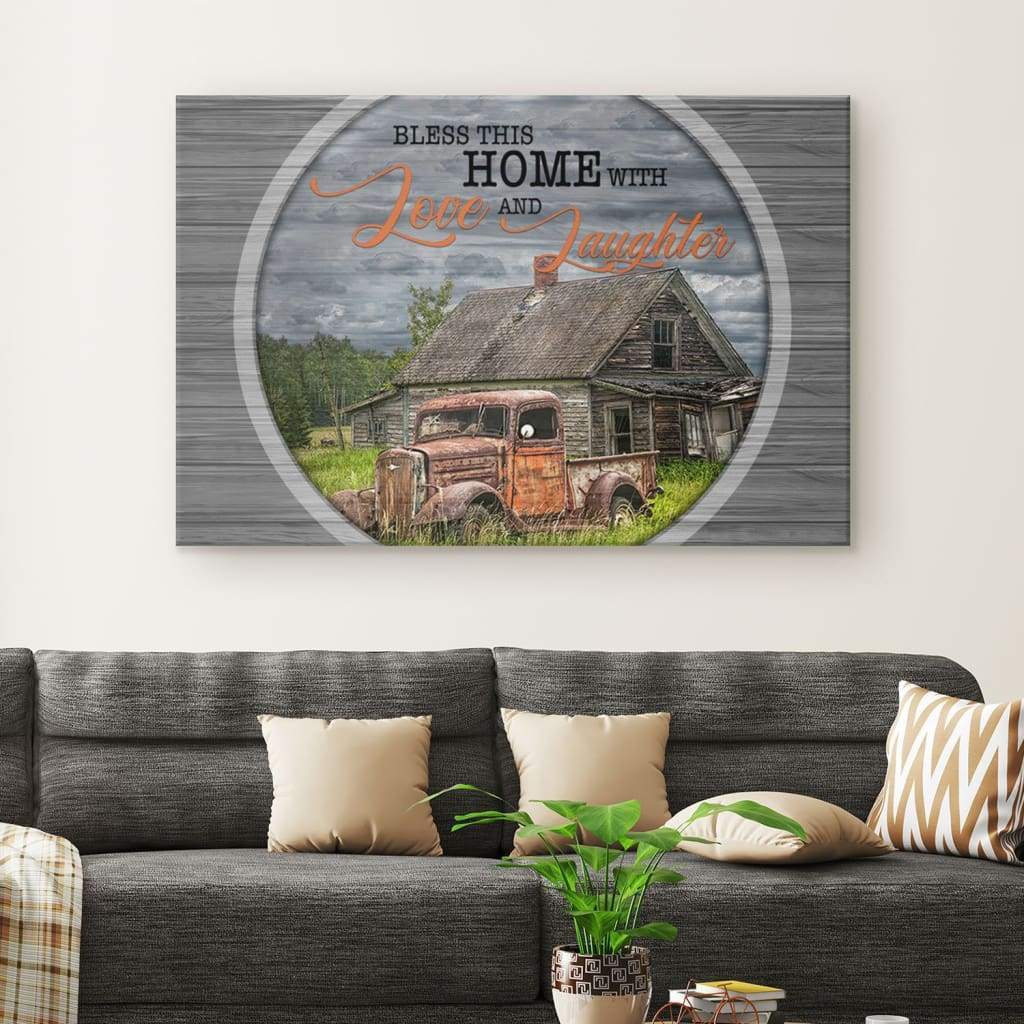 Christian Wall Art – Bless This Home With Love And Laughter, Farmhouse Canvas