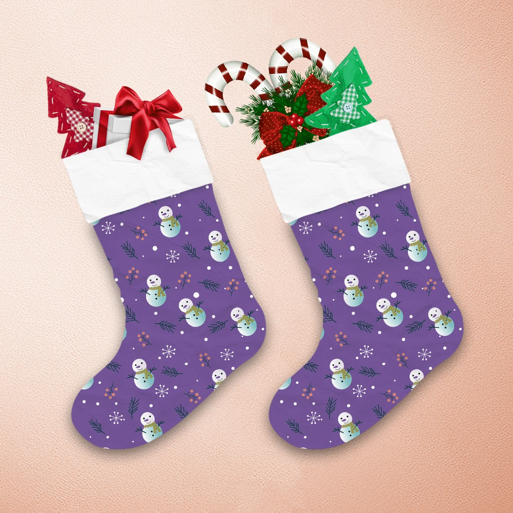 Happy Snowman Pine Leaves Snowflakes And Berries On Purple Background Christmas Stocking