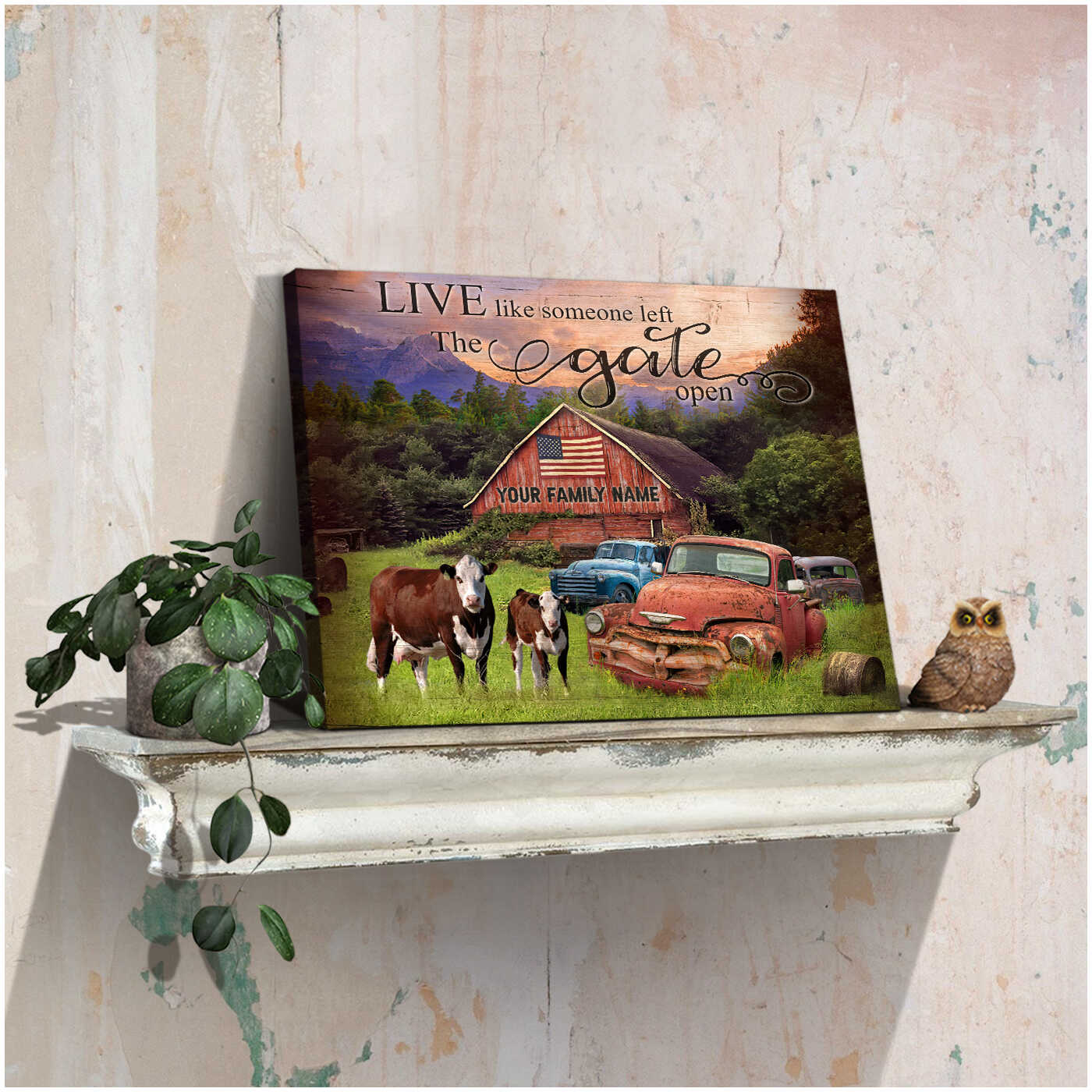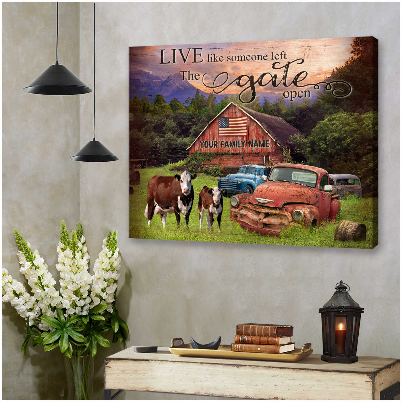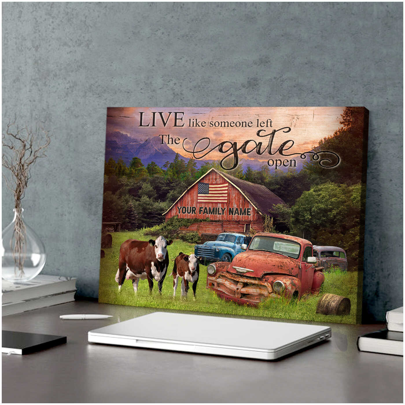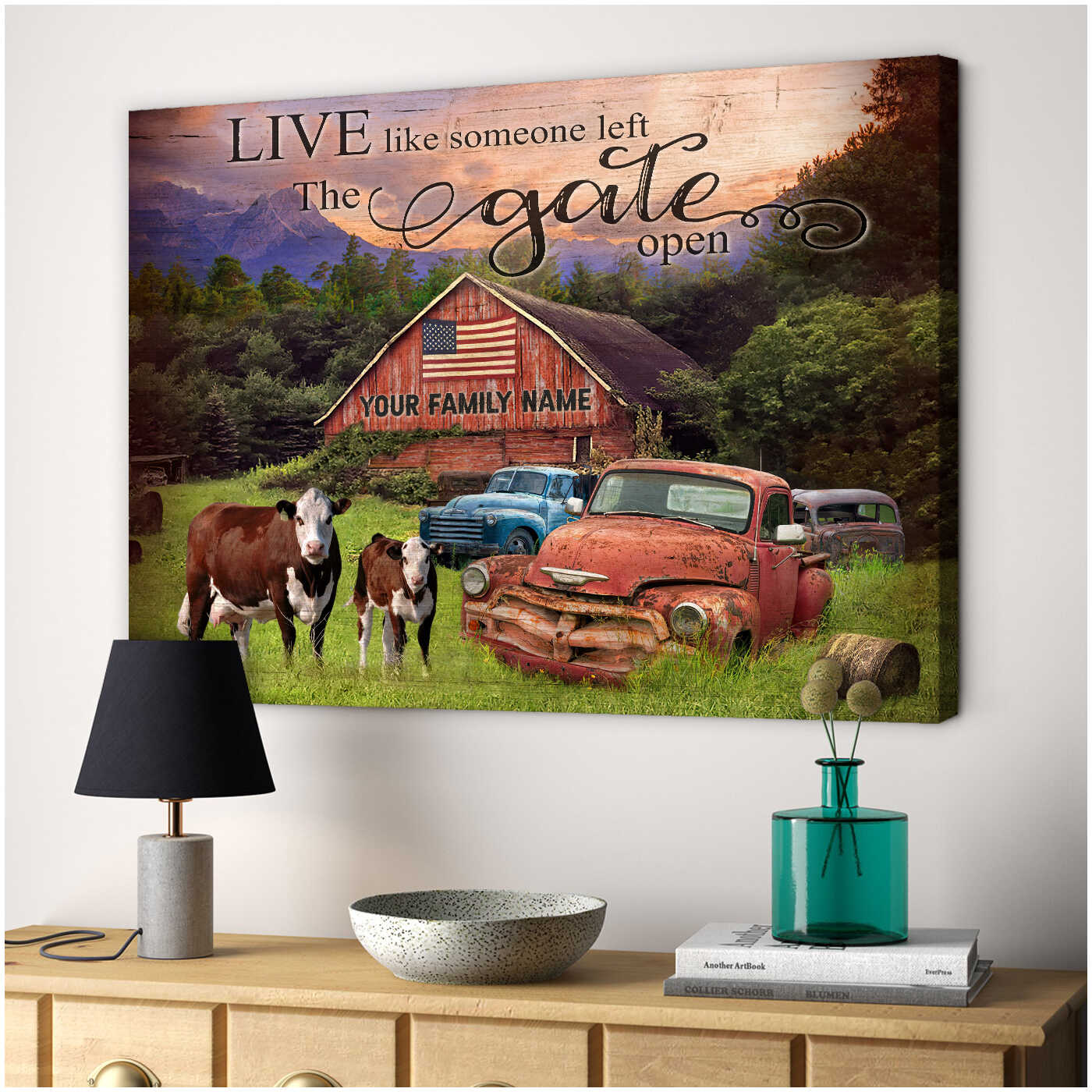 Hereford Cows And Pickup Trucks Live Like Someone Left The Gate Open Custom Name Personalized Canvas Prints Wall Art Decor