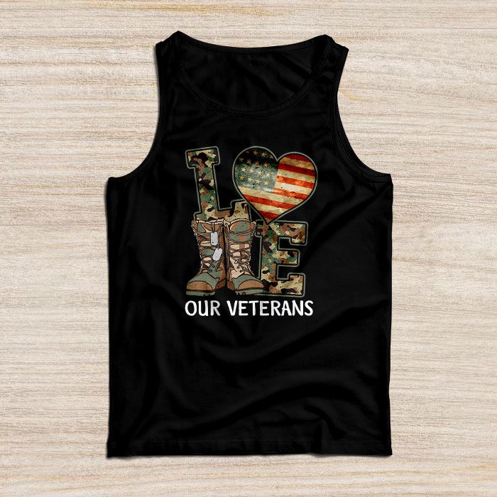 Love Our Veterans Heart USA Flag Camouflage Army Boots Proud T-Shirt