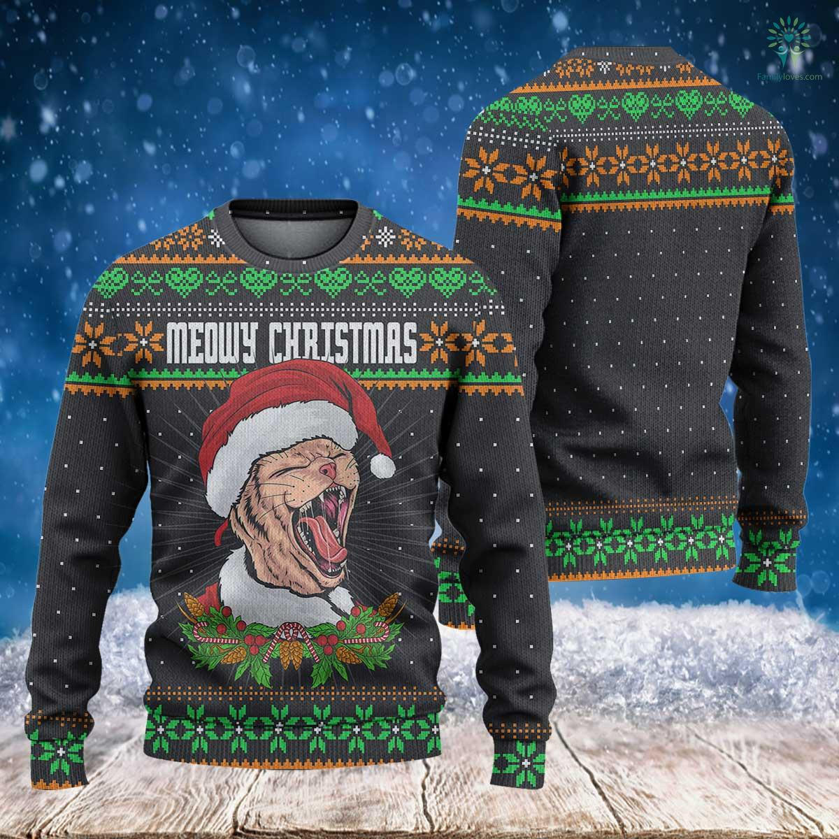 Meowy Christmas Sweatshirt – Ugly Christmas Sweatshirt – Funny Cat Christmas – Knitted Animal Cat – Christmas Sweatshirt