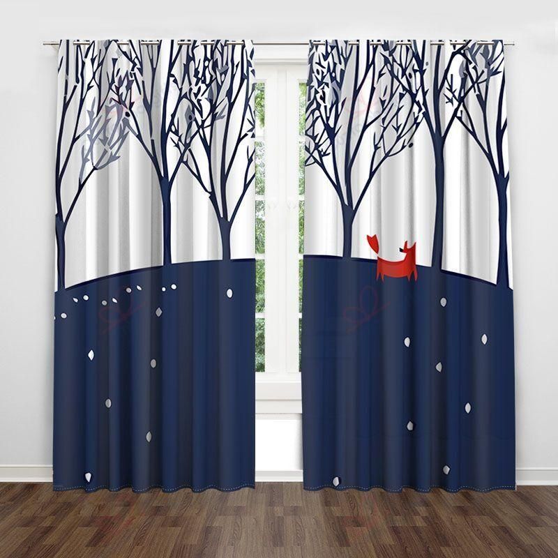 Navy Blue Red Fox Printed Window Curtain Home Decor