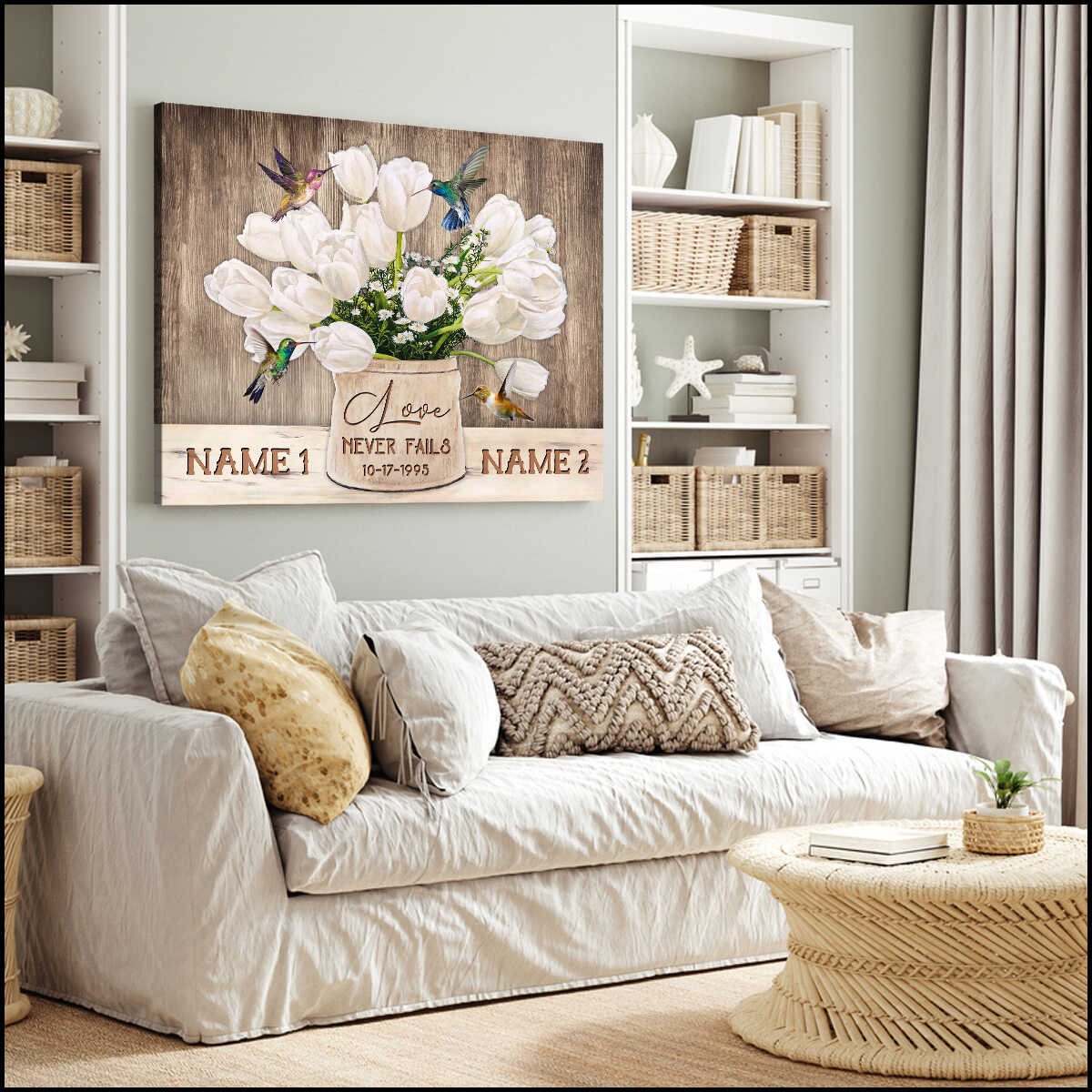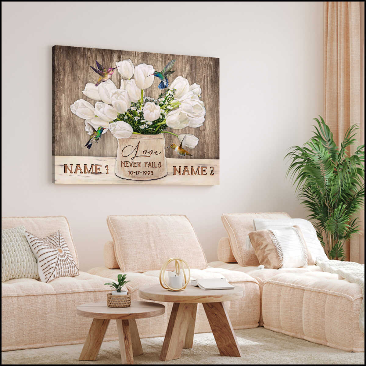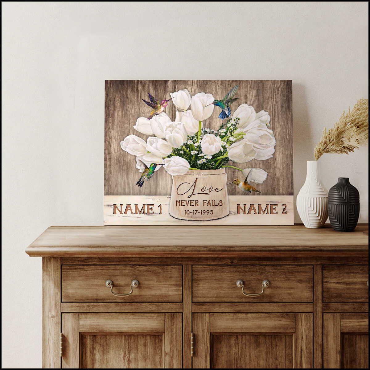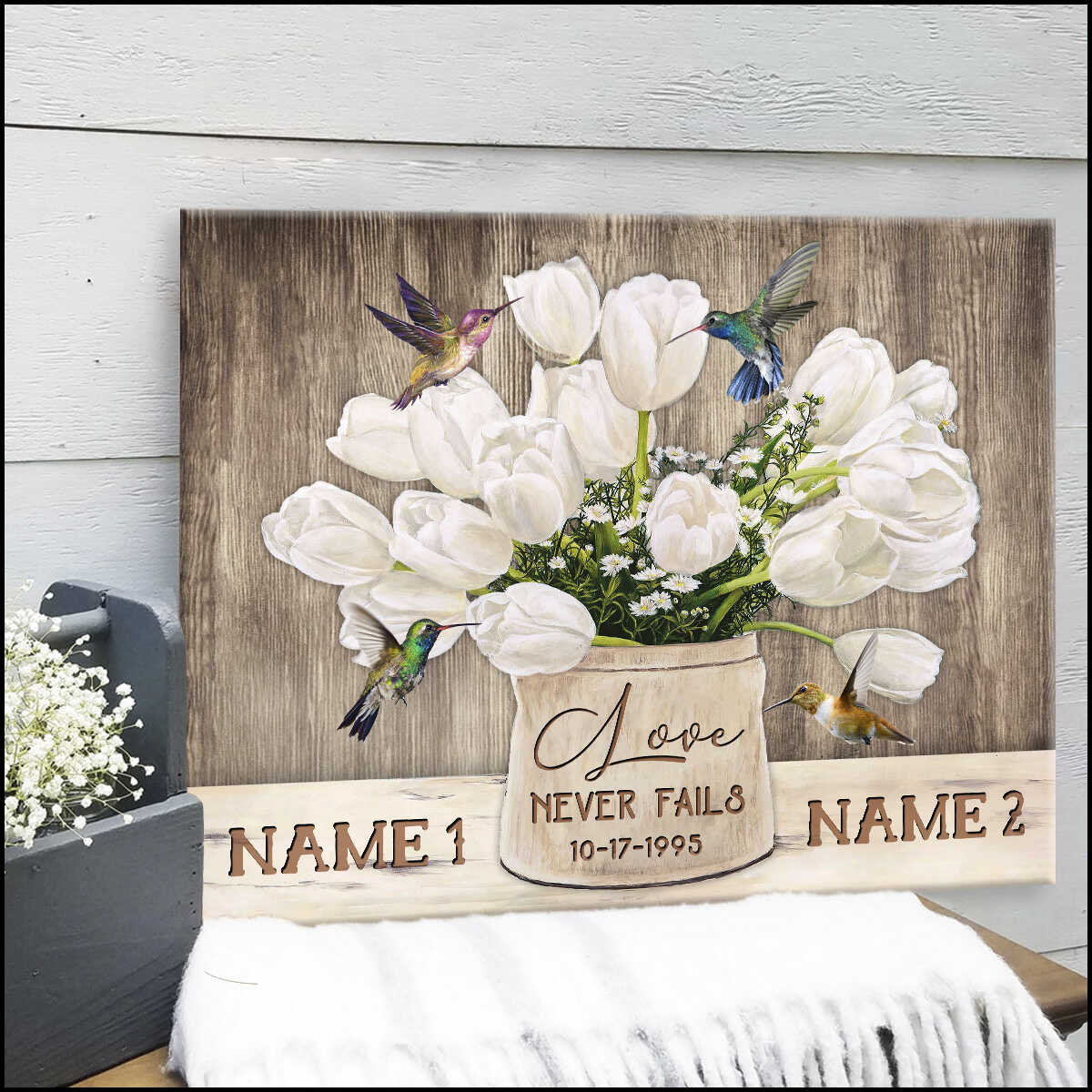 Personalized Custom Name And Date Tulip Flowers And Hummingbirds On Brown Vintage Wood Love Never Fails Canvas Prints Wall Art Decor