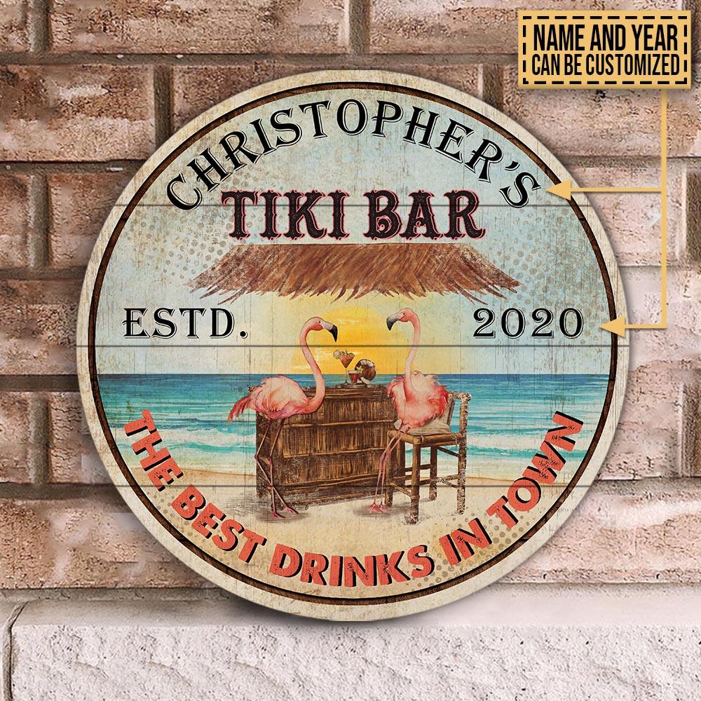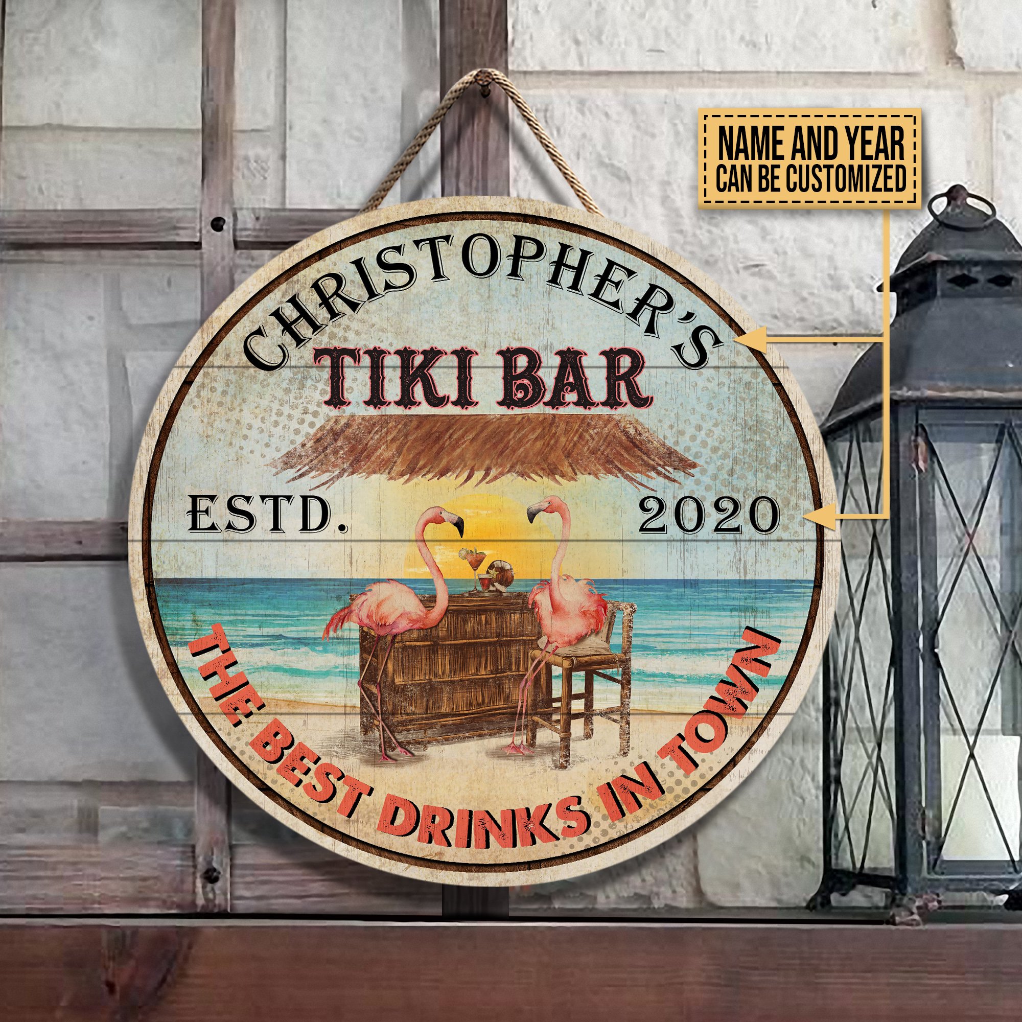 Personalized Flamingo Tiki Bar Customized Wood Circle Sign