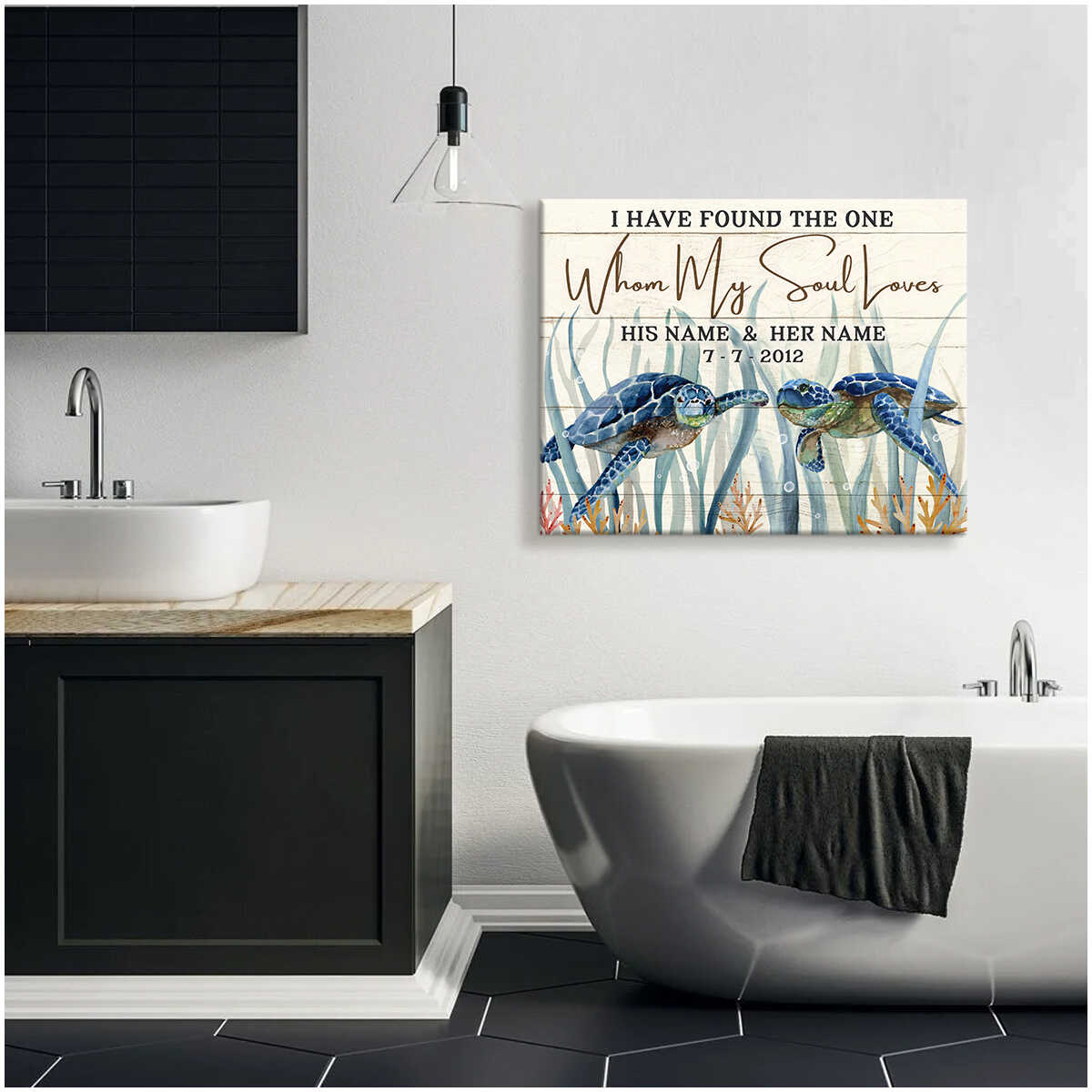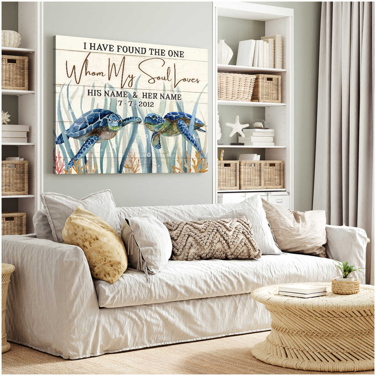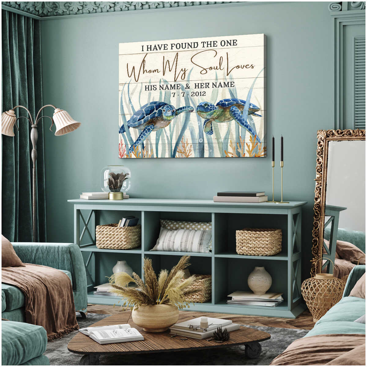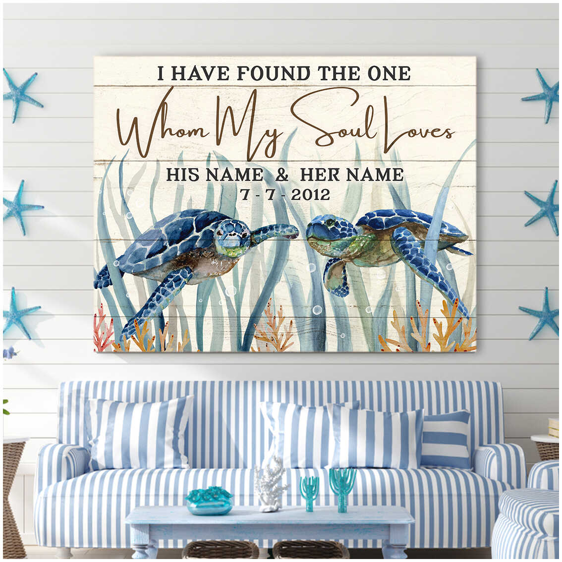 Romantic Couple Turtle I Have Found The One Whom My Soul Loves Custom Name And Date Beach House Coastal Canvas Prints Wall Art Decor