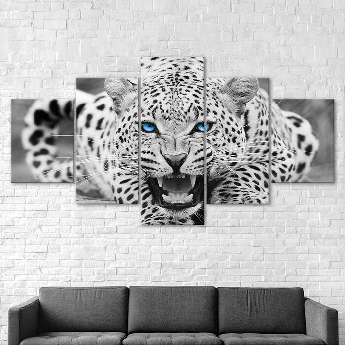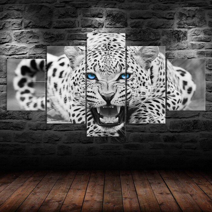 White Leopard Bright Blue Eyes 5 Piece Five Panel Wall Canvas Print Modern Art Poster Wall Art Decor